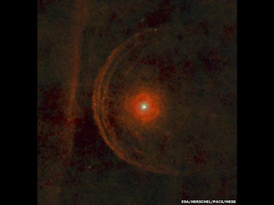 Imagem do Herschel captada em janeiro mostra Betelgeuse, a estrela mais conhecida por nós, em detalhes nunca antes vistos. IMAGEM: ESA/HERSCHEL/PACS/MESS |