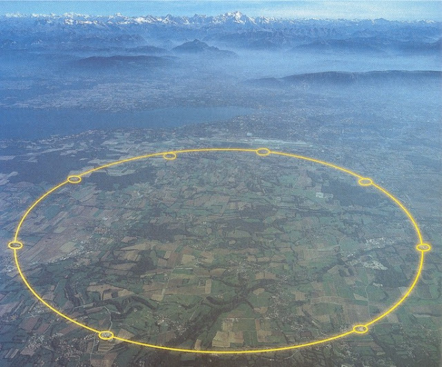 | Foto real de onde o LHC está instalado no subterrâneo. Sua circunferência de 27km está demarcada pelo círculo amarelo. |