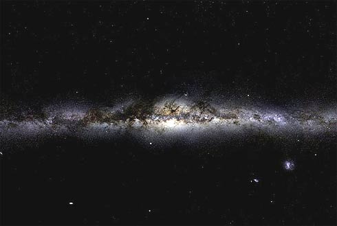 | Olhando para o céu à noite o centro da Via Láctea é visto como na figura, porém mais opaco. O buraco negro é a parte mais luminosa ao centro. |